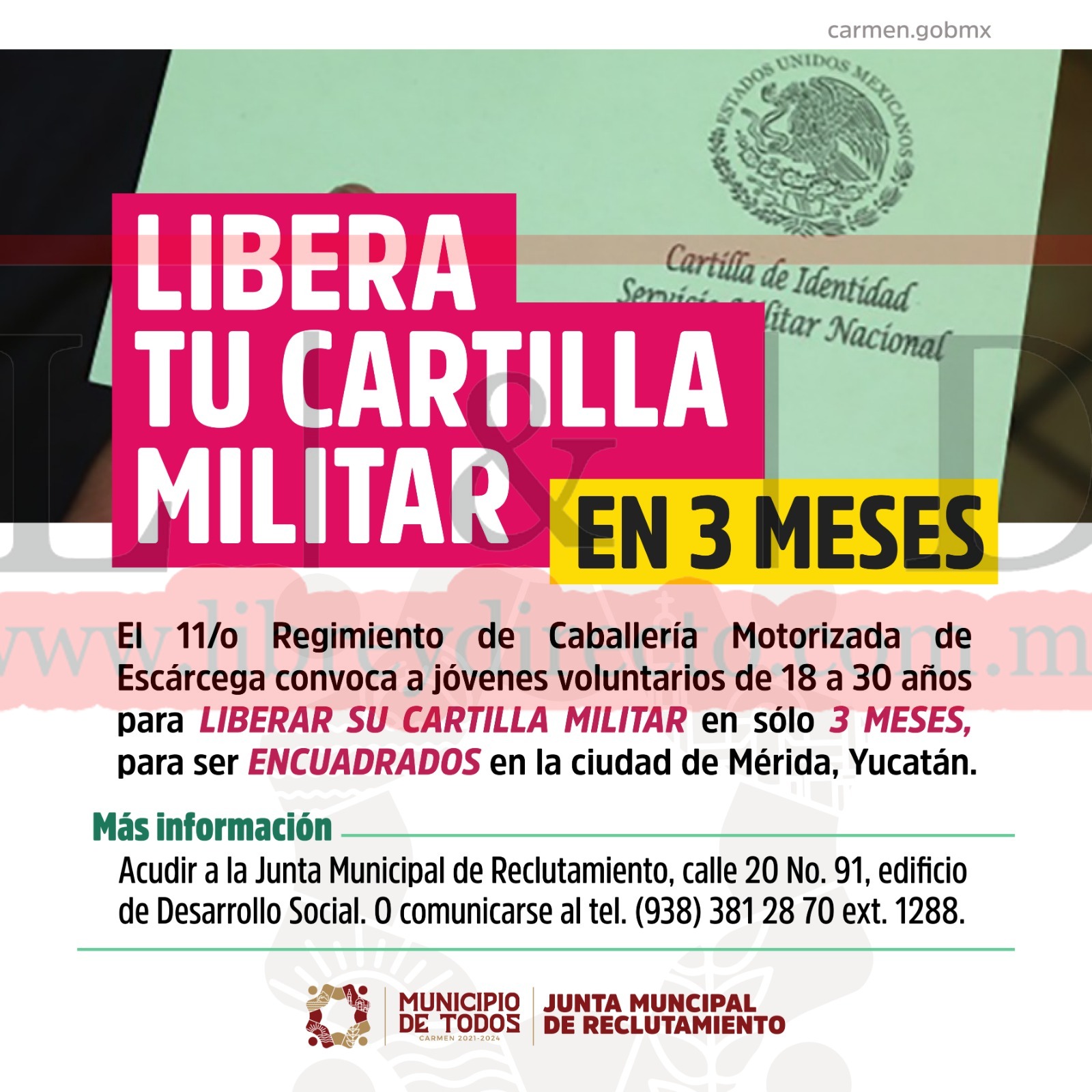 Si estás interesado sólo debes acudir a la Junta Municipal de Reclutamiento del Ayuntamiento de Carmen, ubicada en calle 20 No. 91, edificio de Desarrollo Social, o comunicarse al tel. (938) 381 28 70 ext. 1288, para mayores informes.