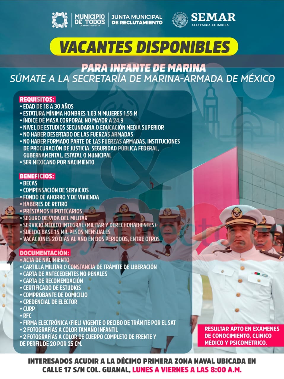 CD DEL CARMEN 01/03/2023.- La Secretaría de Marina (Semar), a través de la Décimo Primera Zona Naval y la Junta a Municipal de Reclutamiento, convoca a hombres y mujeres que tengan de 18 a 30 años a formar parte de sus filas como INFANTE DE MARINA.