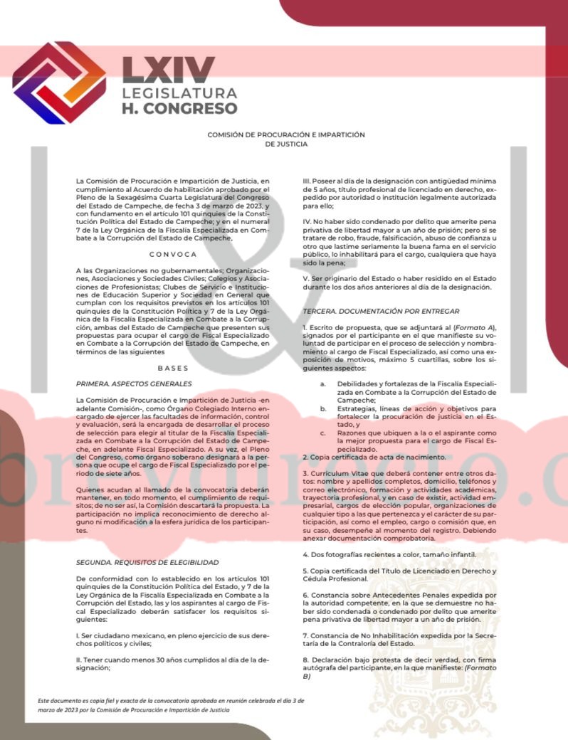 CAMPECHE 04/03/2023.- A través de la Comisión de Procuración e Impartición de Justicia de la 64 Legislatura Estatal, el H. Congreso del Estado dio a conocer la Convocatoria dirigida a las Organizaciones no gubernamentales; Organizaciones, Asociaciones y Sociedades Civiles; Colegios y Asociaciones de Profesionistas; Clubes de Servicio e Instituciones de Educación Superior y Sociedad en General, a presentar sus propuestas para ocupar el cargo de Fiscal Especializado en Combate a la Corrupción del Estado de Campeche.