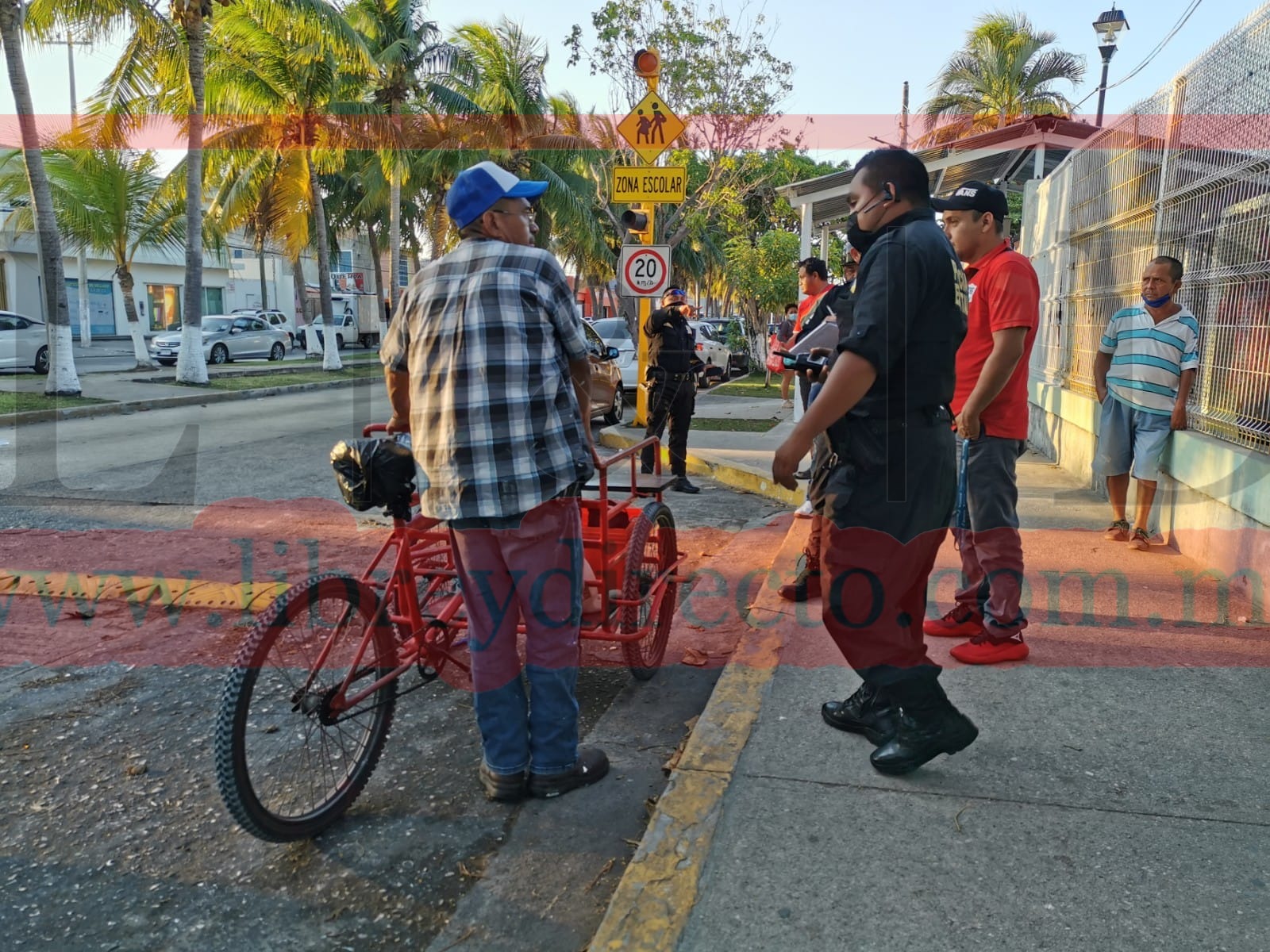 CD DEL CARMEN 04/03/2022.- Un hombre ebrio volcó en su triciclo sobre la avenida Periférica Norte, siendo en ese momento auxiliado por agentes de la Policía Estatal Preventiva que pasaban por el lugar.