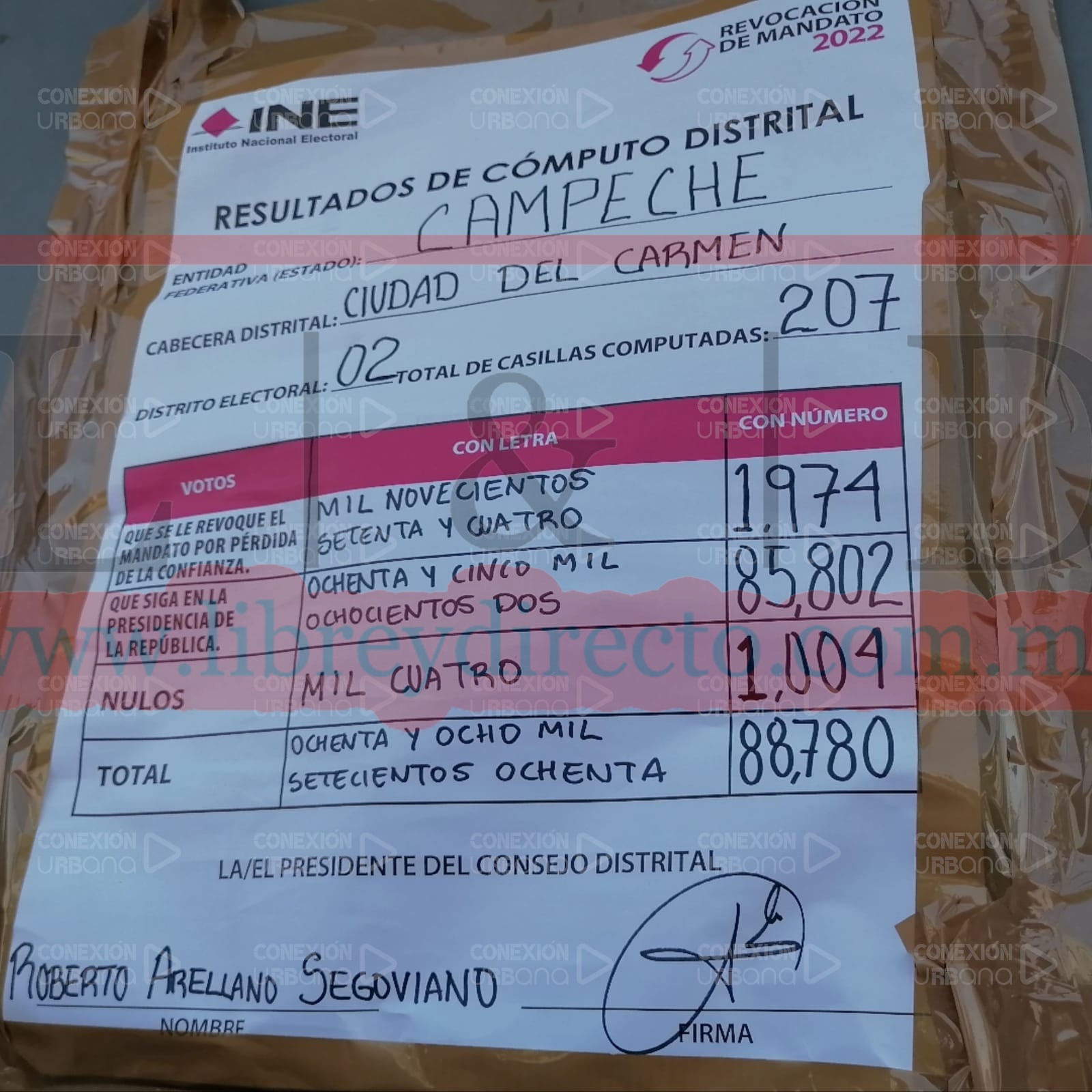 Hoy a las a las 05:35 se concluyó con la lectura en voz alta de los resultados de las actas de jornada para la revocación de mandato, de escrutinio y cómputo, su captura en el sistema informático y el cómputo paralelo de los paquetes que se determinaron a recuento en los grupos de trabajo, en la sede del 02 distrito del INE en Ciudad del Carmen.