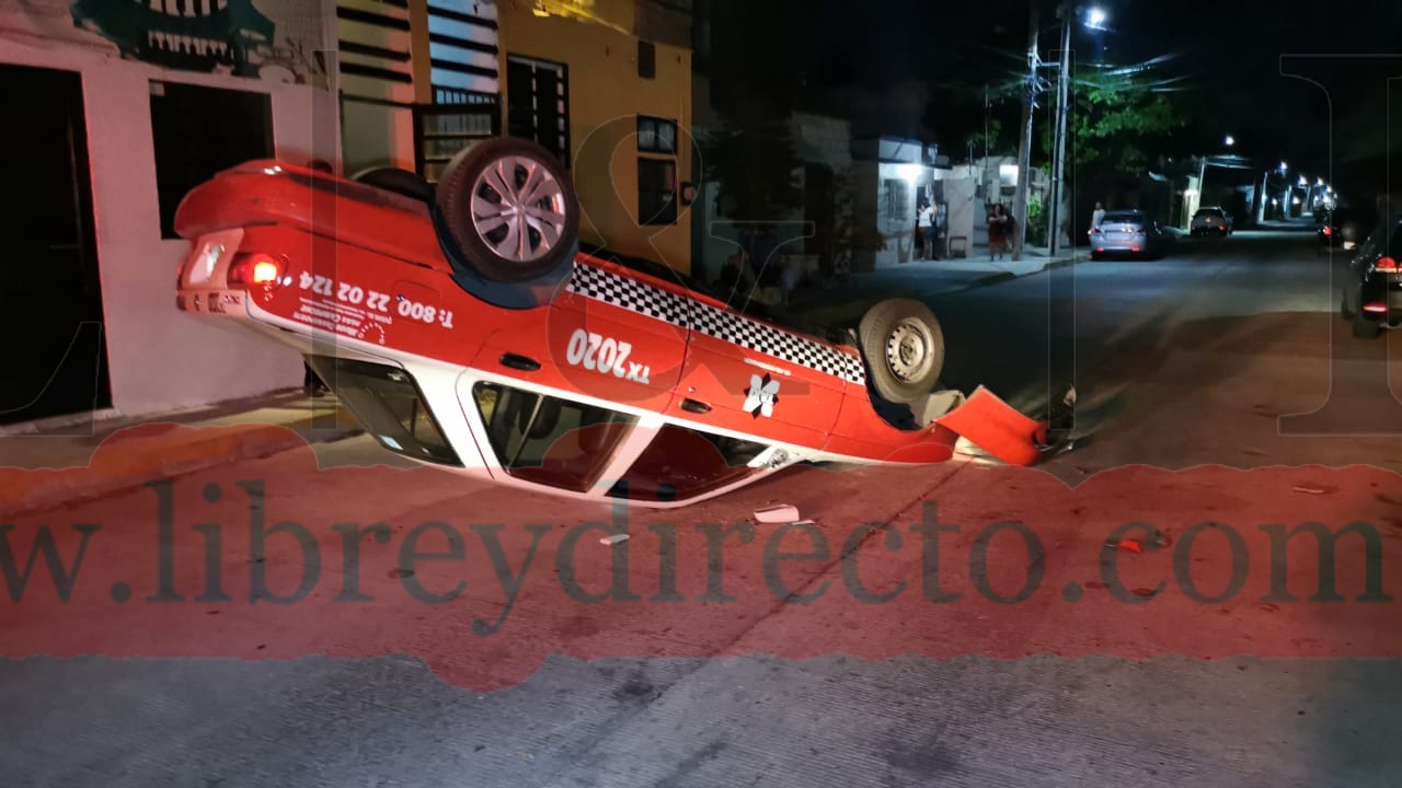 CD DEL CARMEN 14/04/2022.- Más de 24 horas al volante y el cansancio provocaron que el conductor de un taxi se dormitara al momento de conducir por las calles de la colonia Benito Juárez impactándose contra una camioneta estacionada para luego volcar; los daños materiales ascendieron a más de 80 mil pesos.