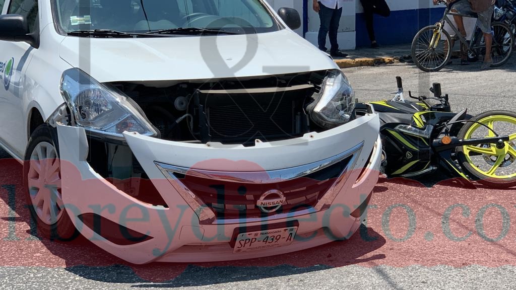Circulaba en aparente preferencia mismo que no logró frenar a tiempo y se proyecto contra el frente del vehículo para terminar en el pavimento con golpes contusos en el cuerpo Pero afortunadamente nada de gravedad, tanto el vehículo como la motocicleta presentaron daños de regular cuantía.