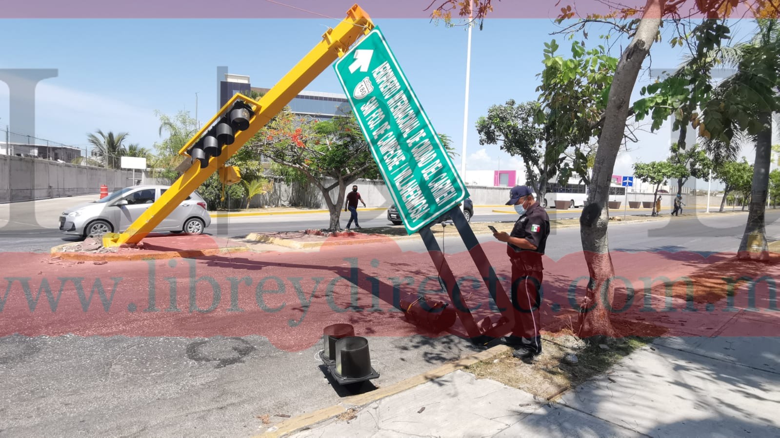 Al no medir bien las dimensiones de la pesada unidad término por derribar un poste de semáforo con señalizaciones a la vista, pero en lugar de detenerse para activar su seguro decidió darse ala fuga sin contar que sería detenido en la Colonia puntilla Sobre la avenida 10 de julio por calle 15.
