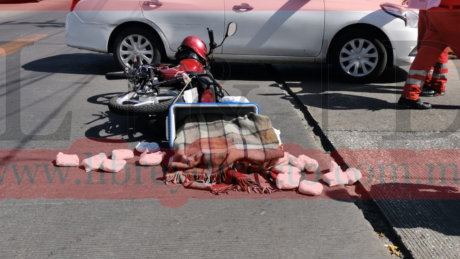 El percance ocurrió cerca de las 11:00 horas de esta mañana, cuando los ocupante de la motocicleta Italika, color rojo, matrícula de circulación dedicada al reparto de tortilla, se desplazaban sobre la calle 58 con dirección al mercado Morelos de la Colonia Morelos, cuándo al llegar al cruce con la calle 57.