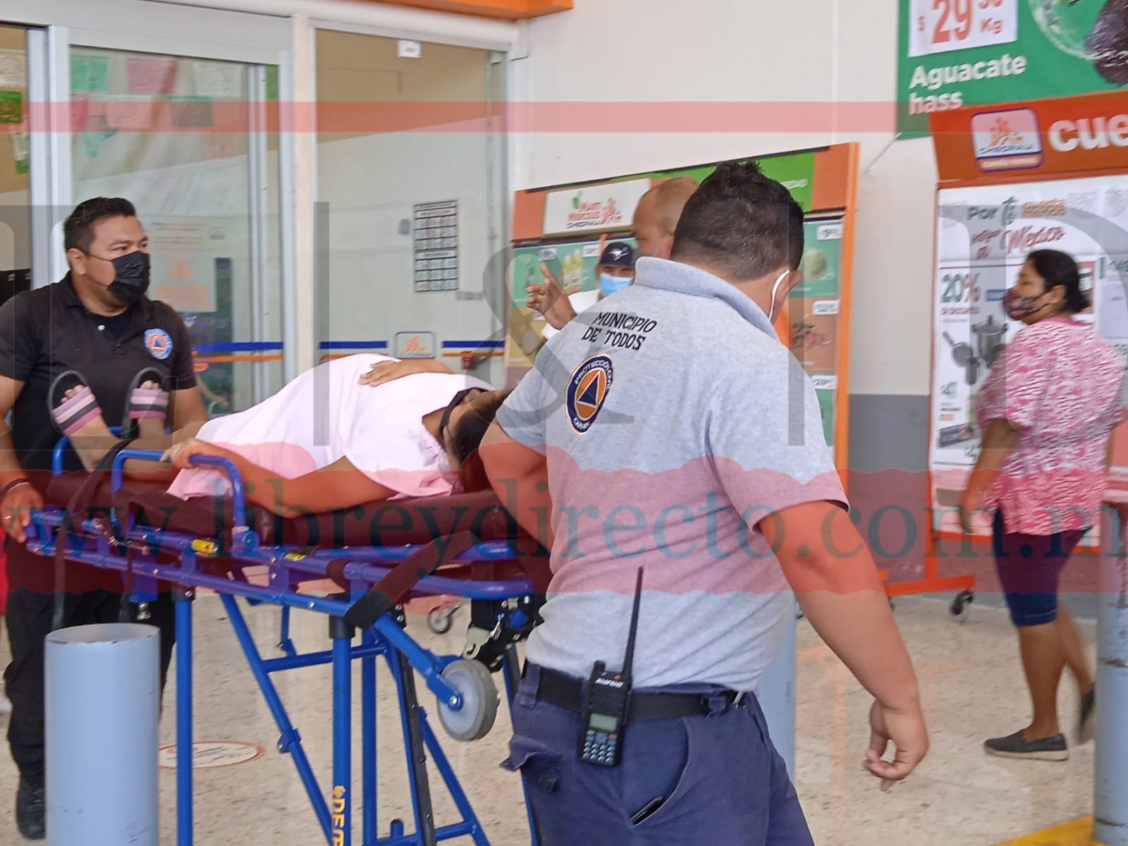 La joven resbaló justamente frente a servicio al cliente, por lo que de inmediato fue asistida por personal de seguridad y de primeros auxilios del supermercado, mientras solicitaban de una ambulancia a los números de emergencia, arribando personal paramédico de protección civil.