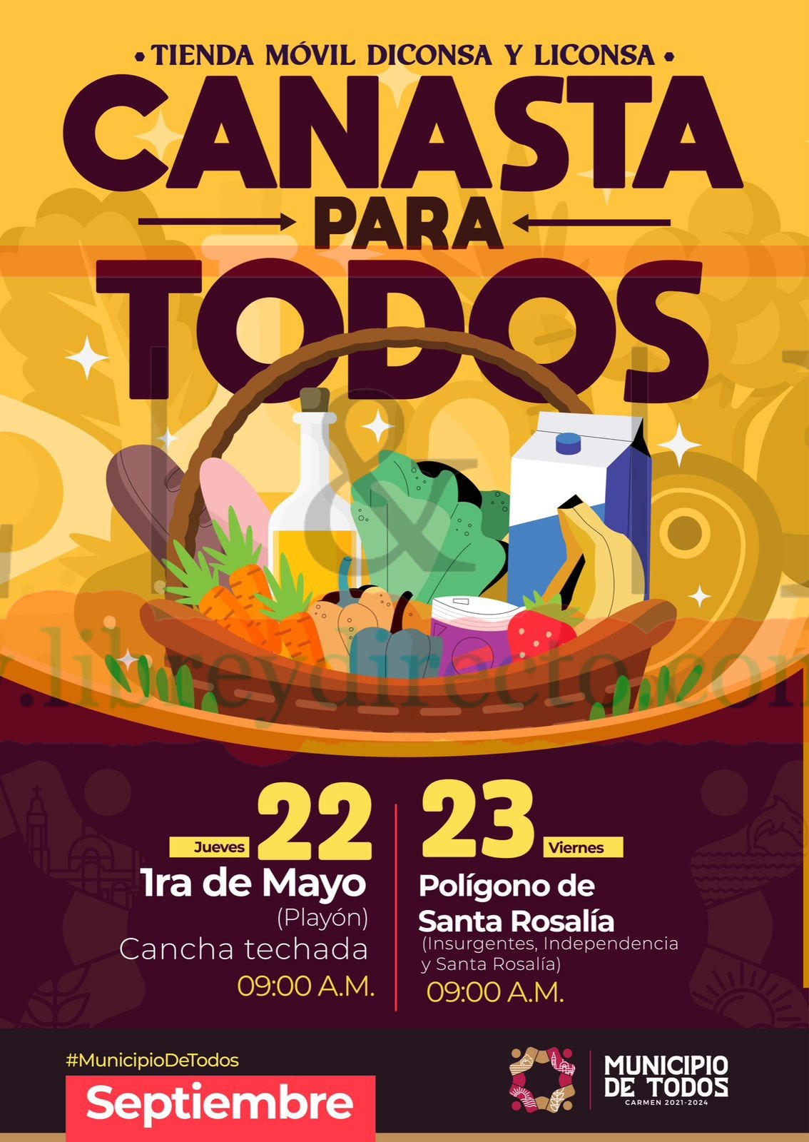 CD DEL CARMEN 21/09/2022.- El programa “Canasta para Todos” llega MAÑANA jueves a la Cancha Techada de la col. 1 de Mayo (Playón), a las 09:00 A.M. y el viernes 23 en el Polígono de Santa Rosalía, que abarca las colonias Insurgentes, Independencia y Santa Rosalía, a las 9:00 A.M., donde podrás encontrar productos e insumos básicos a bajo costo.